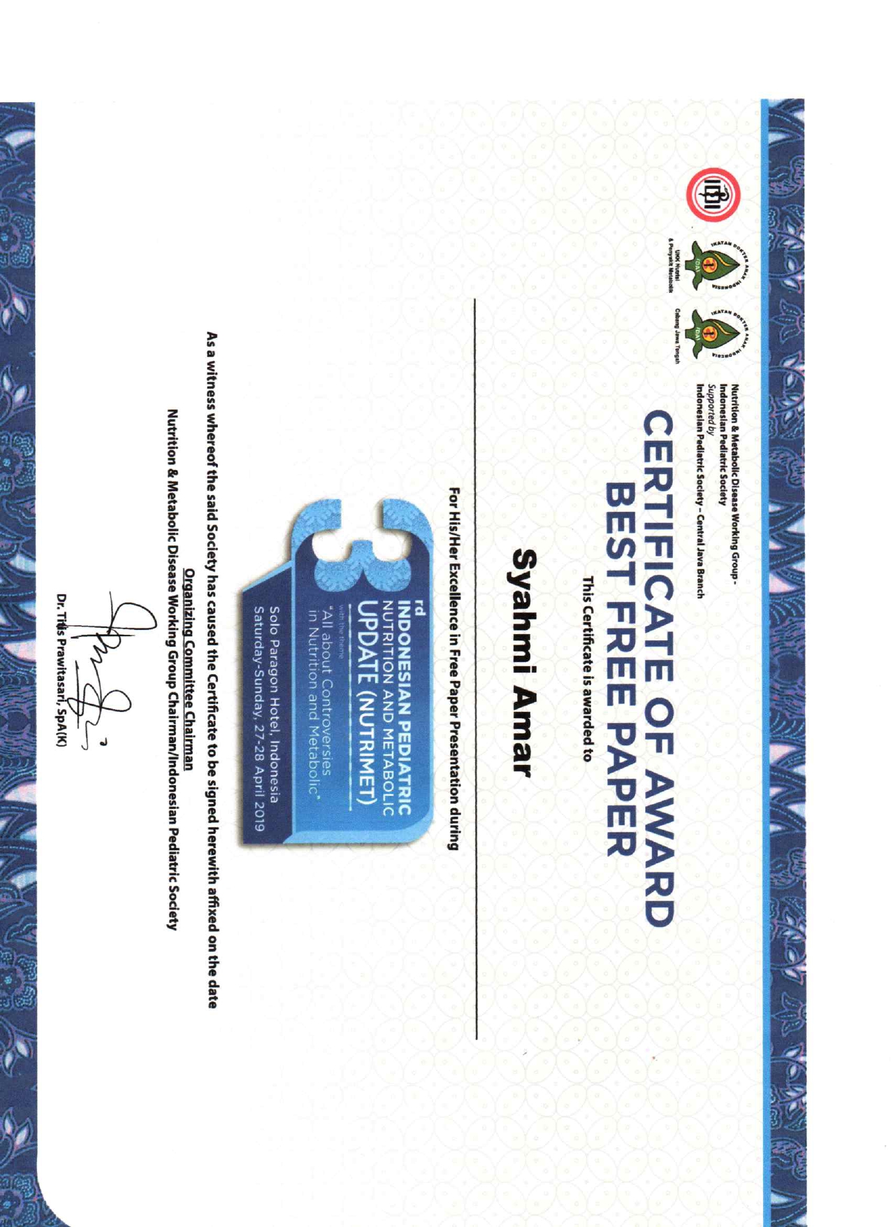 3RD Indonesian Pediatric Nutrition and Metabolic Update (NUTRIMET) 2019 yang diadakan pada tanggal 27 - 28 April 2019 yang bertempat di Solo Paragon Hotel, Solo dengan tema " All about Controversies in Nutrition and Metabolic". NUTRIMET yang diadakan selama 2 hari dengan agenda sebagai berikut :
