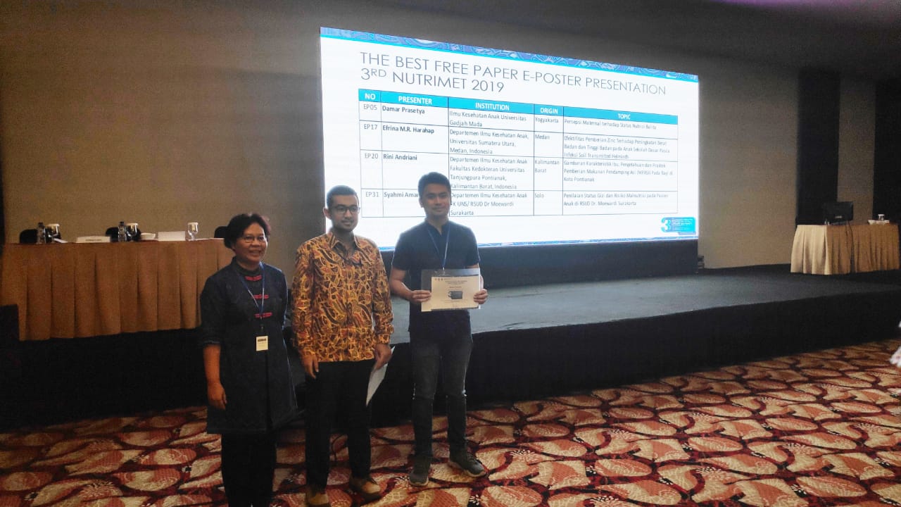 Selain Symposium dan Workshop yang diikuti oleh Dokter Spesialis juga diikuti oleh PPDS. Salah satu PPDS Prodi Ilmu Kesehatan Anak dr. Syahmi Amar terpilih sebagai Best Free Paper Presentation dengan judul Assessment of Nutritional Status and Nutritional Risk of Hospitalized Children in Dr. Moewardi General Hospital.
