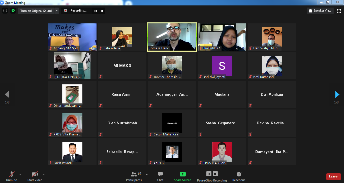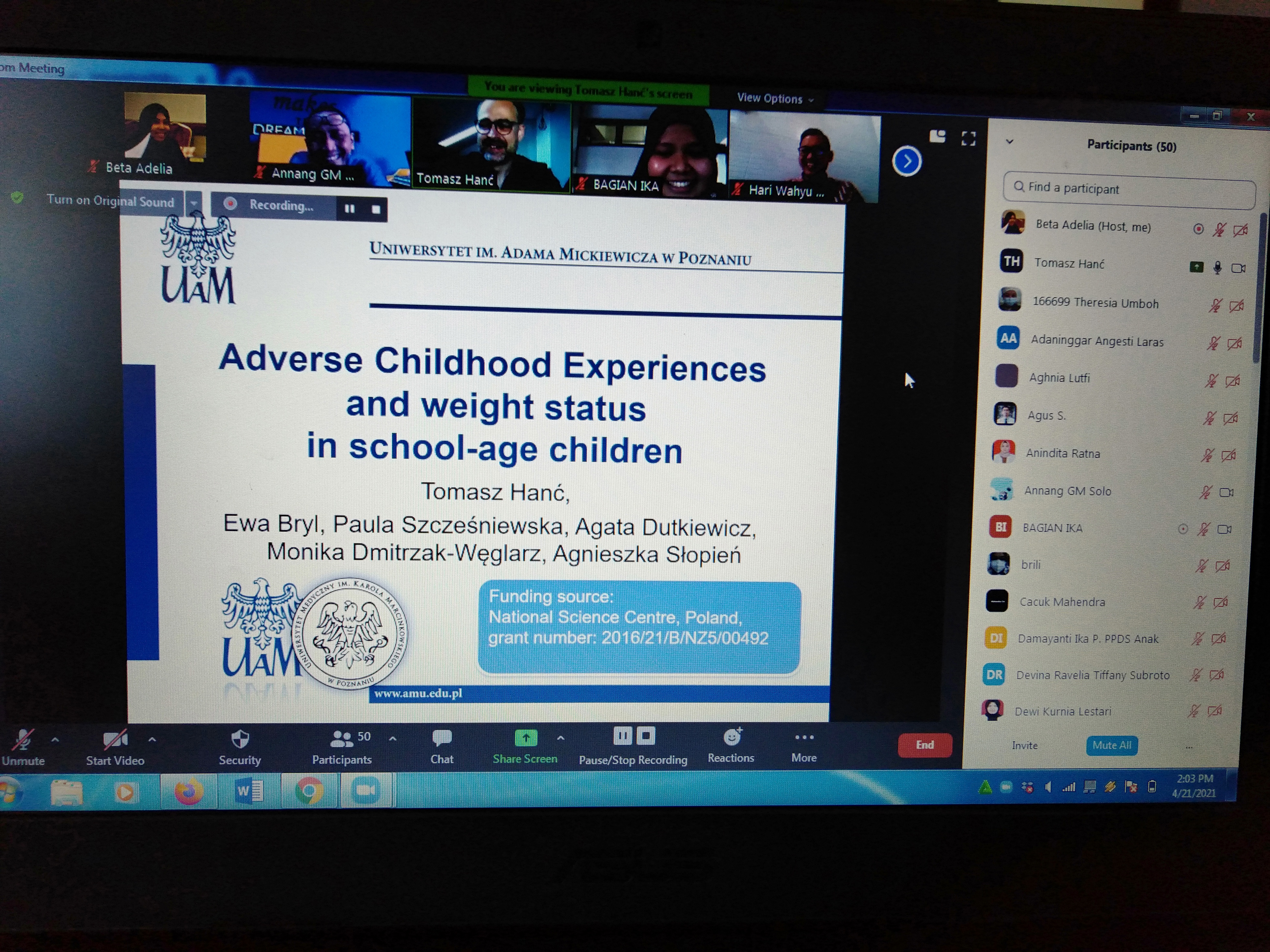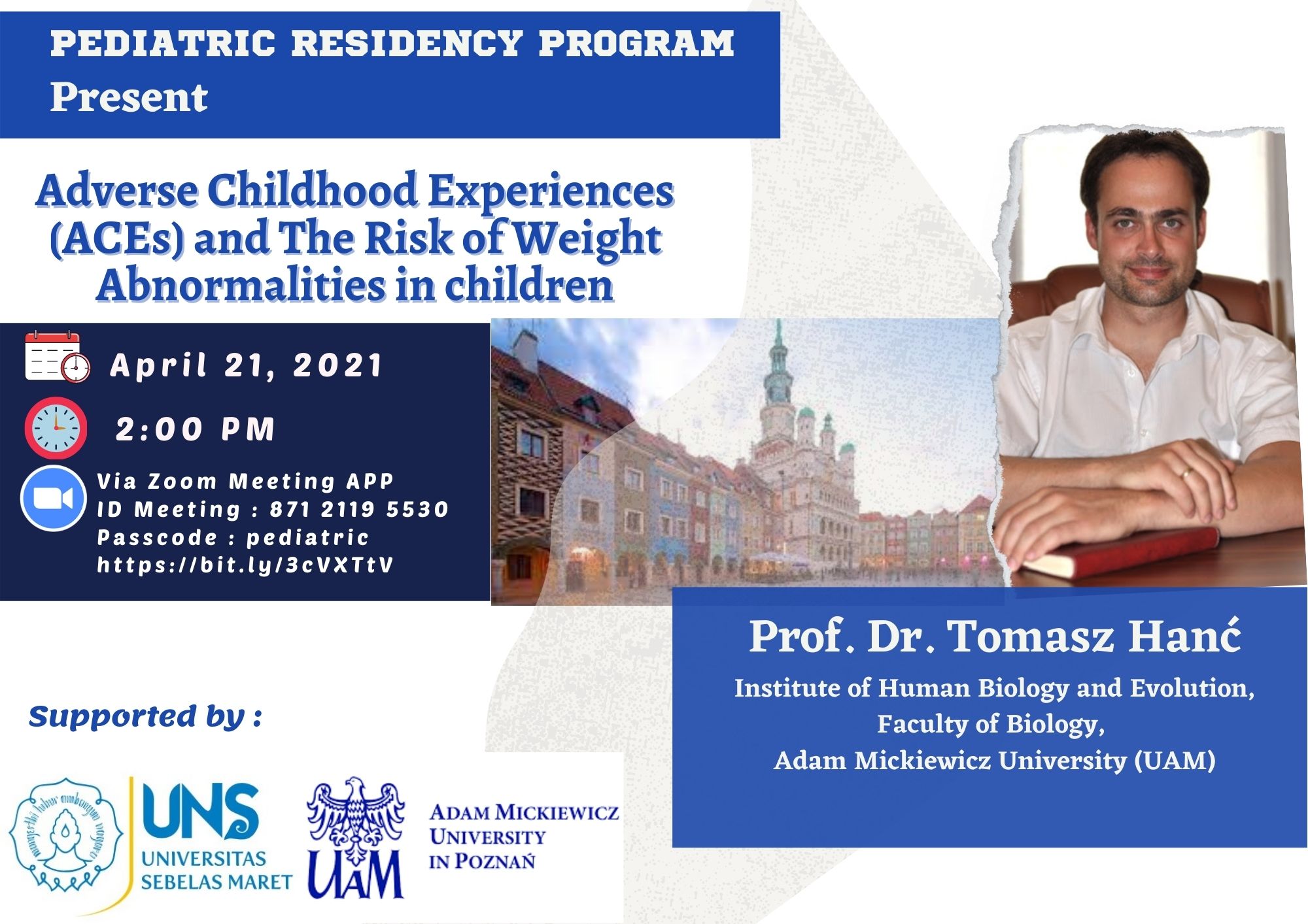 Kuliah tamu yang diadakan pada hari Rabu, 21 April 2021 Pembicara oleh Prof. DR. Tomasz Hanć dengan tema Adverse Childhood Experiences (ACEs) and The Risk of Weight Abnormalities in Children, Institute of Human Biology and Evolution, Faculty of Biology, Adam Mickiewicz University (UAM) in Poznan. Kuliah tamu yang diikuti oleh PPDS Ilmu Kesehatan Anak dan Staf pengajar Ilmu Kesehatan Anak juga beberapa PPDS Ilmu Kesehatan Anak dari beberapa Universitas di Indonesia. Sebagai host dr. RR. Dewi Sitoresmi. Dikarenakan adanya pandemi Covid 19 maka kuliah tamu dilakukan secara online menggunakan aplikasi zoom.
