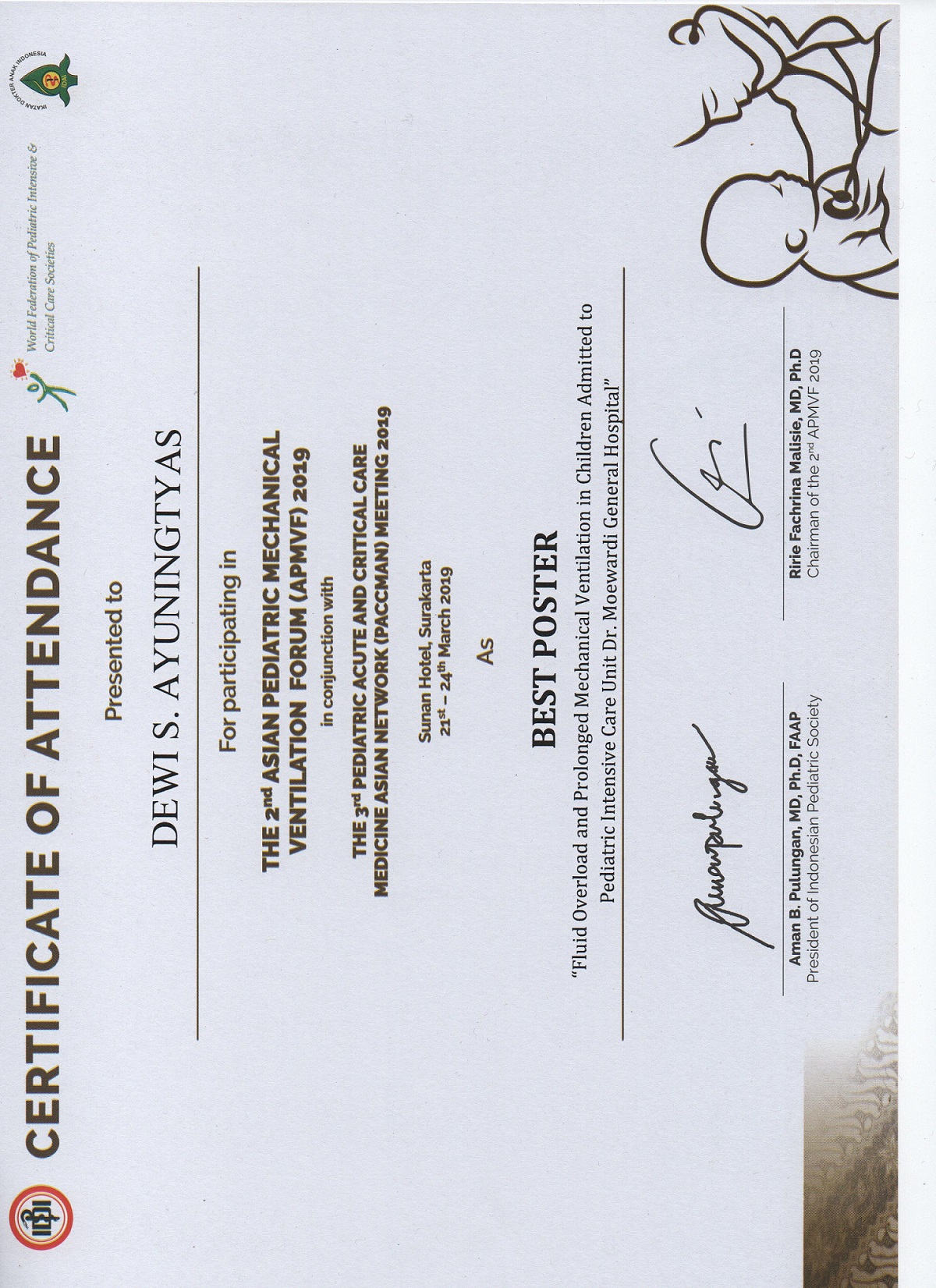 The 2nd ASIAN PEDIATRIC MECHANICAL VENTILATION FORUM (APMVF) 2019 yang diadakan di Sunan Hotel, 21 - 24 Maret 2019. Kegiatan yang terdiri dari Pre Congress Workshop yang diadakan pada tanggal 21- 22 Maret 2019. Salah satu PPDS Prodi Ilmu Kesehatan Anak dr. RR Dewi Sitoresmi memenangkan Best Poster dengan judul Fluid overload and prolonged mechanical ventilation in children admitted to Pediatric Intensive Care Unit Dr. Moewardi General Hospital .