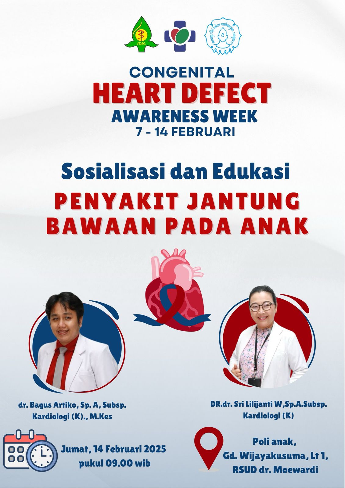 Kegiatan dalam rangka Hari Congenital Heart Disease (CHD) Awareness yang diperingati di tanggal 7-14 Februari 2025, Prodi Ilmu Kesehatan Anak FK UNS menyelenggarakan Sosialisasi dan Edukasi Penyakit Jantung Bawaan Pada Anak dengan oleh Dr. dr. Sri Lilijanti, Sp. A(K) dan dr. Bagus Artiko, Sp.A(K), M. Kes yang merupakan dokter spesialis anak subdivisi Kardiologi di Poli Anak Gedung Wijaya Kusuma Lantai 1 pada tanggal Jumat 14 Februari 2025.