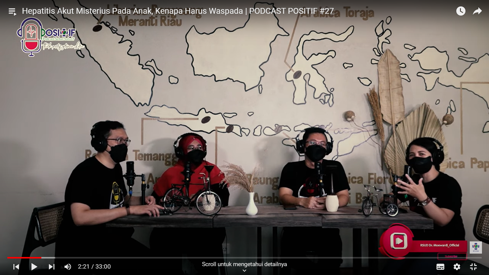 RSUD Dr. Moewardi memberikan informasi untuk meningkatkan mutu pelayanan kepada masyarakat dalam kegiatan live streaming "POSITIF (Podcas Sehat Solutif)" yang diadakan pada hari Jumat, 20 Mei 2022 bertempat di Hotel Solia Zigna Laweyan, Jl. Dr. Rajiman No.525, Laweyan, Kec. Laweyan. Kota Surakarta, dengan topik "Hepatitis Akut Misterius Pada Anak, Kenapa Harus Waspada". Narasumber adalah dr. Hari Wahyu Nugroho, Sp.A(K), M.Kes, yang merupakan dokter spesialis dokter spesialis anak dan staf pengajar sub divisi Tumbuh Kembang dan Pediatri Sosial dan dr. Evi Rokhayati, Sp.A(K), M.Kes, yang merupakan dokter spesialis dokter spesialis anak dan staf pengajar sub divisi Gastroenterologi.