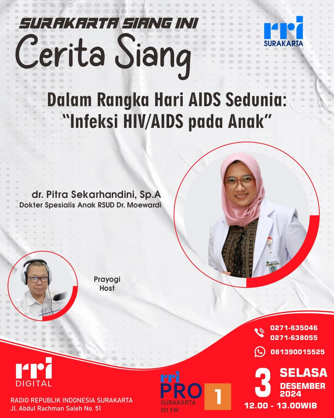 RSUD Dr. Moewardi bekerjasama dengan RRI Surakarta memberikan informasi untuk meningkatkan mutu pelayanan kepada masyarakat dalam Kegiatan "Cerita Siang" yang diadakan pada hari Selasa, 3 Desember 2024 dilakukan secara live streaming Jam 12.00 - 13.00 WIB, Narasumber adalah dr. Pitra Sekarhandini, Sp.A, yang merupakan dokter spesialis anak dan staf pengajar sub divisi Alergi Imunologi.