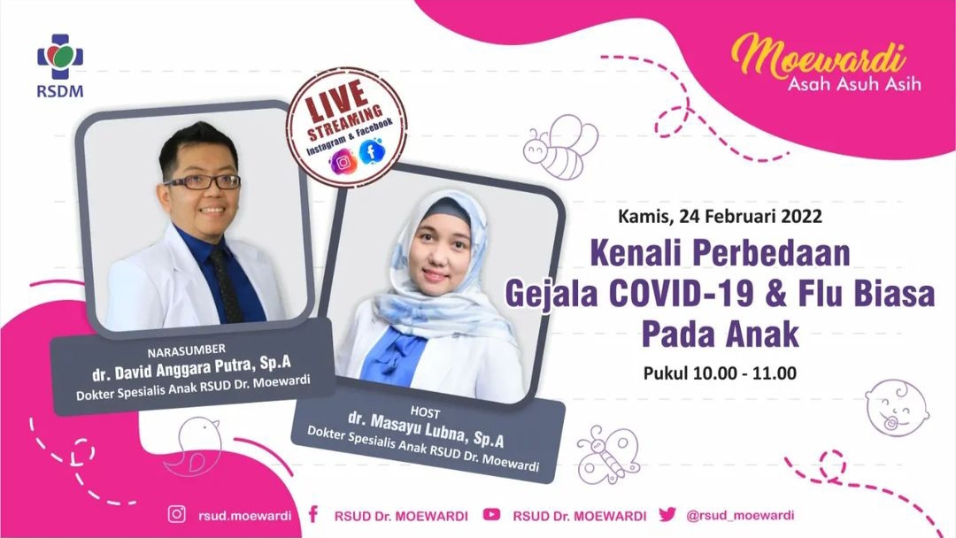 RSUD Dr. Moewardi memberikan informasi untuk meningkatkan mutu pelayanan kepada masyarakat dalam kegiatan live streaming "Moewardi Asah Asuh Asih" yang diadakan pada hari Kamis, 24 Februari 2022 di Gedung Wijaya Kusuma lantai 3 dengan topik Kenali Perbedaan Gejala COVID-19 & Flu Biasa pada Anak. Narasumber adalah dr. David Anggara Putra, Sp.A yang merupakan dokter spesialis anak dan staf pengajar sub divisi Respirologi.