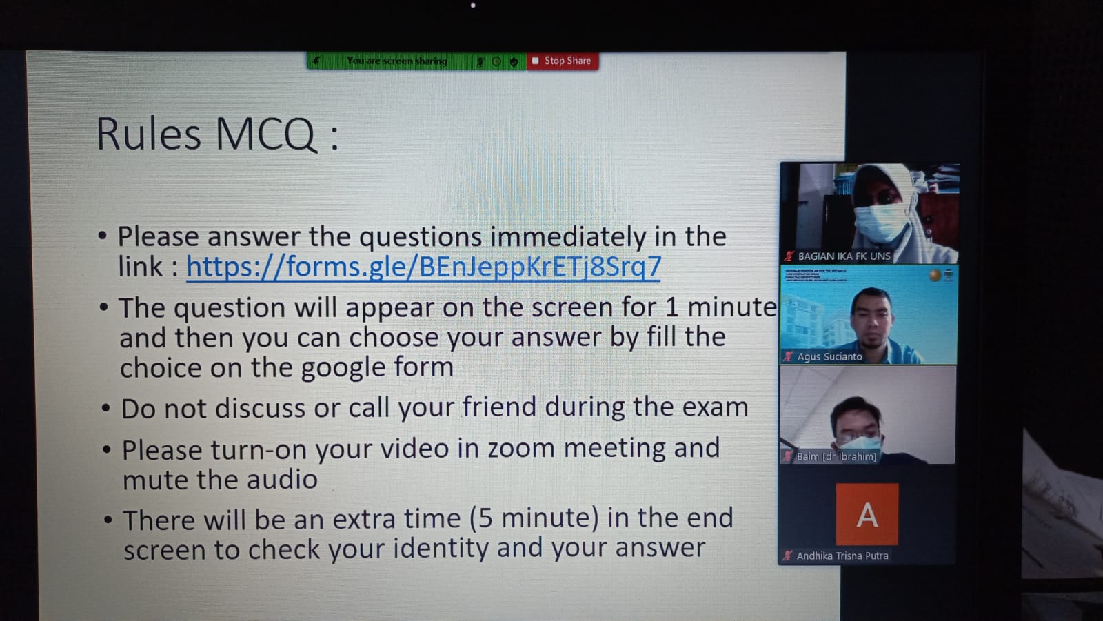 PPDS I Ilmu Kesehatan Anak pada hari Kamis tanggal 12 Agustus 2021 mengikuti ujian MCQ Lokal Bulan Agustus 2021. Ujian diikuti oleh 57 PPDS yang terdiri dari 15 PPDS tahap Junior, 16 PPDS Tahap Madya dan 26 PPDS Tahap Senior. Terdapat 2 PPDS yang sedang stase di RS Mitra (RS UNS dan RSUD Dr. Soeroto) dan 1 PPDS yang sedang cuti ikut juga melaksanakan ujian dalam waktu yang bersamaan dan jawabannya dikirimkan lewat google form dan ujian dilakukan dengan daring via zoom. MCQ Lokal dilaksanakan 4 kali setiap tahun yaitu Bulan Februari, Mei, Agustus, dan November.