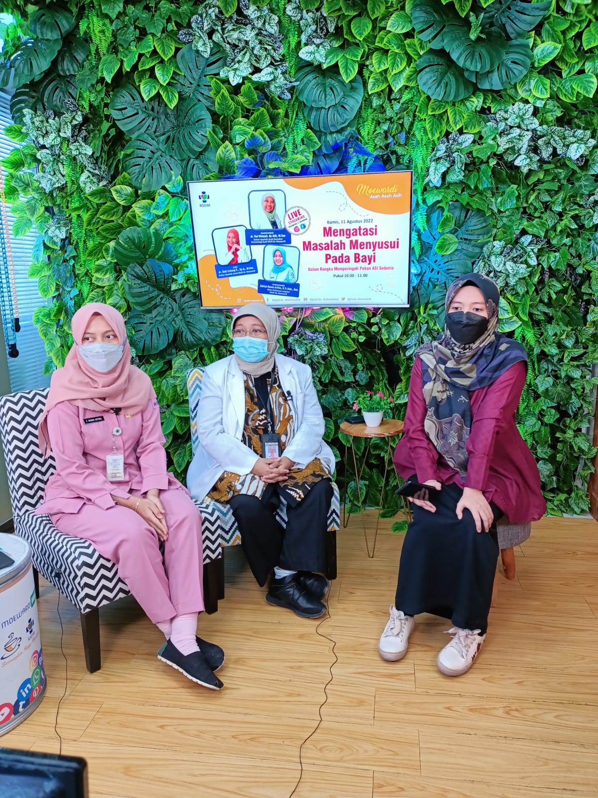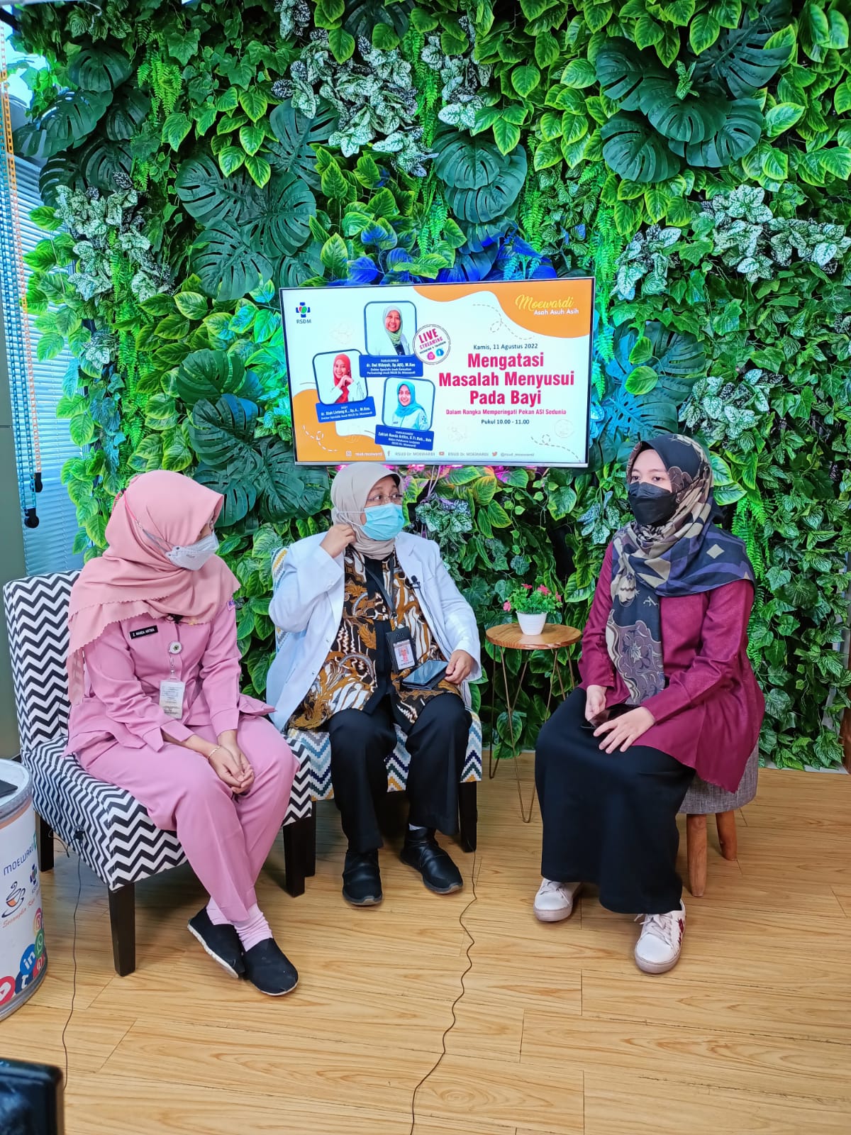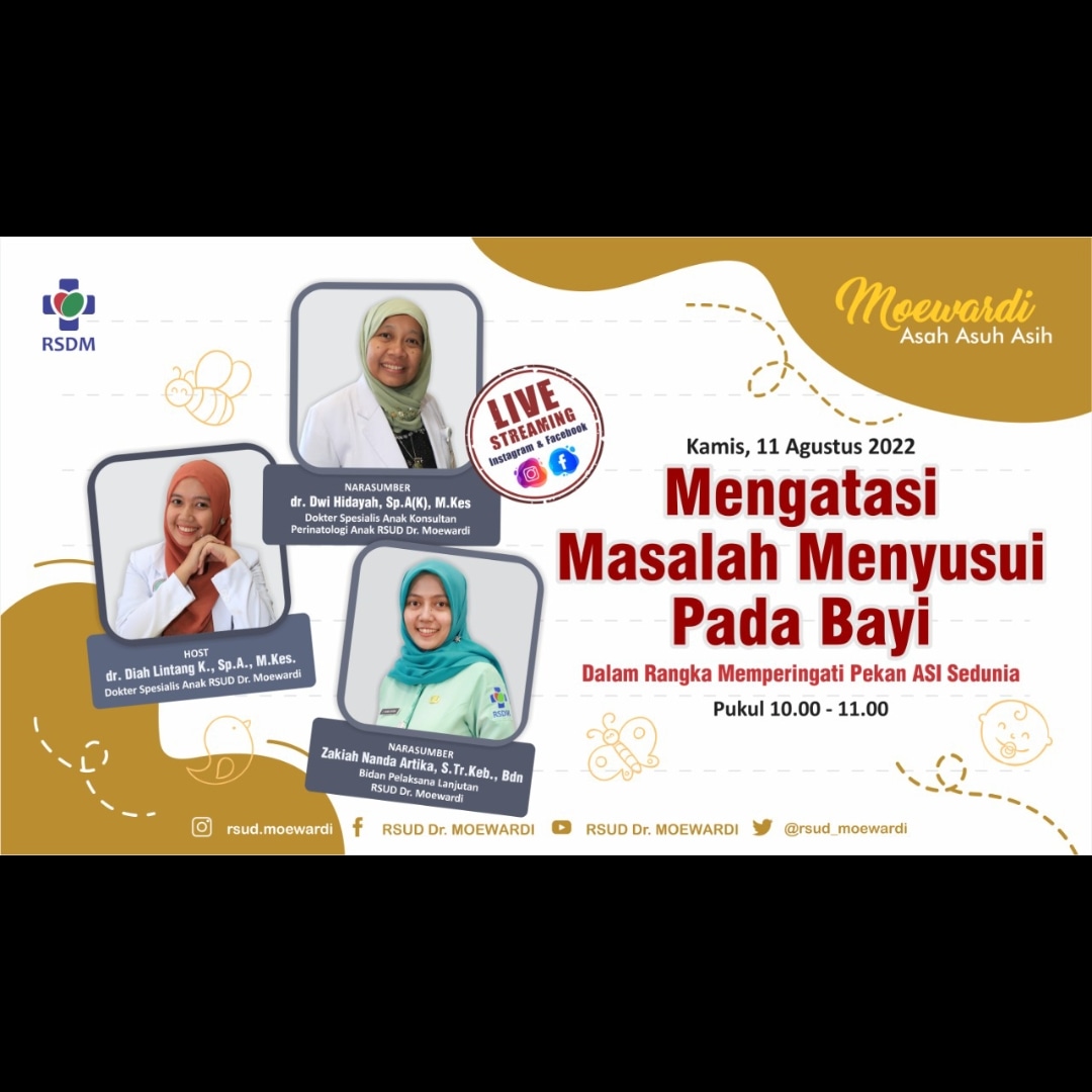 RSUD Dr. Moewardi memberikan informasi untuk meningkatkan mutu pelayanan kepada masyarakat dalam kegiatan live streaming "Moewardi Asah Asuh Asih" yang diadakan pada hari Kamis, 11 Agustus 2022 di Gedung Wijaya Kusuma lantai 3 dengan topik Mengatasi Masalah Menyusui Pada Bayi. Narasumber adalah dr. Dwi Hidayah, Sp.A(K), M.Kes, yang merupakan dokter spesialis dokter spesialis anak dan staf pengajar sub divisi Neonatologi dan Zakiah Nanda Artika,S.Tr.Keb., Bdn yang merupakan Bidan Pelaksana Lanjutan.