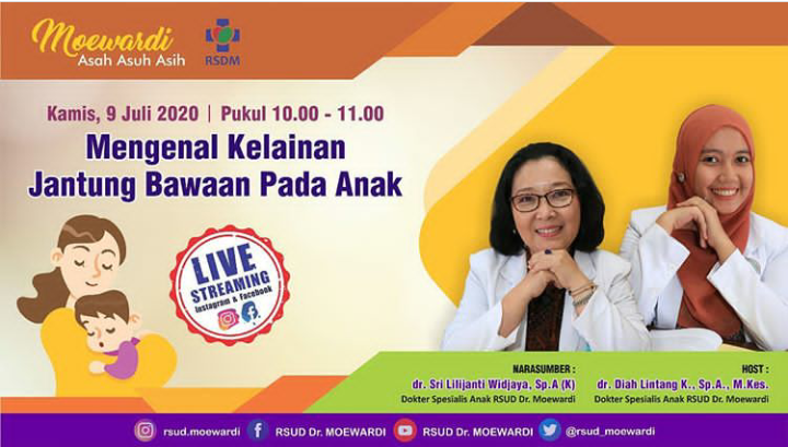 RSUD Dr. Moewardi memberikan informasi untuk meningkatkan mutu pelayanan kepada masyarakat dalam kegiatan live streaming "Moewardi Asah Asuh Asih" yang diadakan pada hari Kamis, 9 Juli 2020 di Gedung Wijaya Kusuma lantai 3 dengan topik Mengenal Kelainan Jantung Bawaan Pada Anak. Narasumber adalah dr. Sri Lilijanti, Sp.A(K) yang merupakan dokter spesialis anak dan staf pengajar sub divisi Kardiologi.