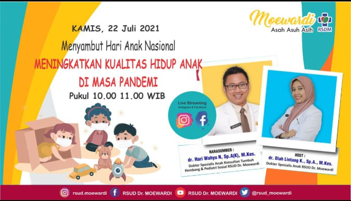 RSUD Dr. Moewardi memberikan informasi untuk meningkatkan mutu pelayanan kepada masyarakat dalam kegiatan live streaming "Moewardi Asah Asuh Asih" yang diadakan pada hari Kamis, 22 Juli 2021 di Gedung Wijaya Kusuma lantai 3 dengan topik Meningkatkan Kualitas Hidup Anak Di Masa Pandemi. Narasumber adalah dr. Hari Wahyu Nugroho, Sp.A(K), M. Kes yang merupakan dokter spesialis anak dan staf pengajar sub divisi Tumbuh Kembang dan Pediatrik Sosial.