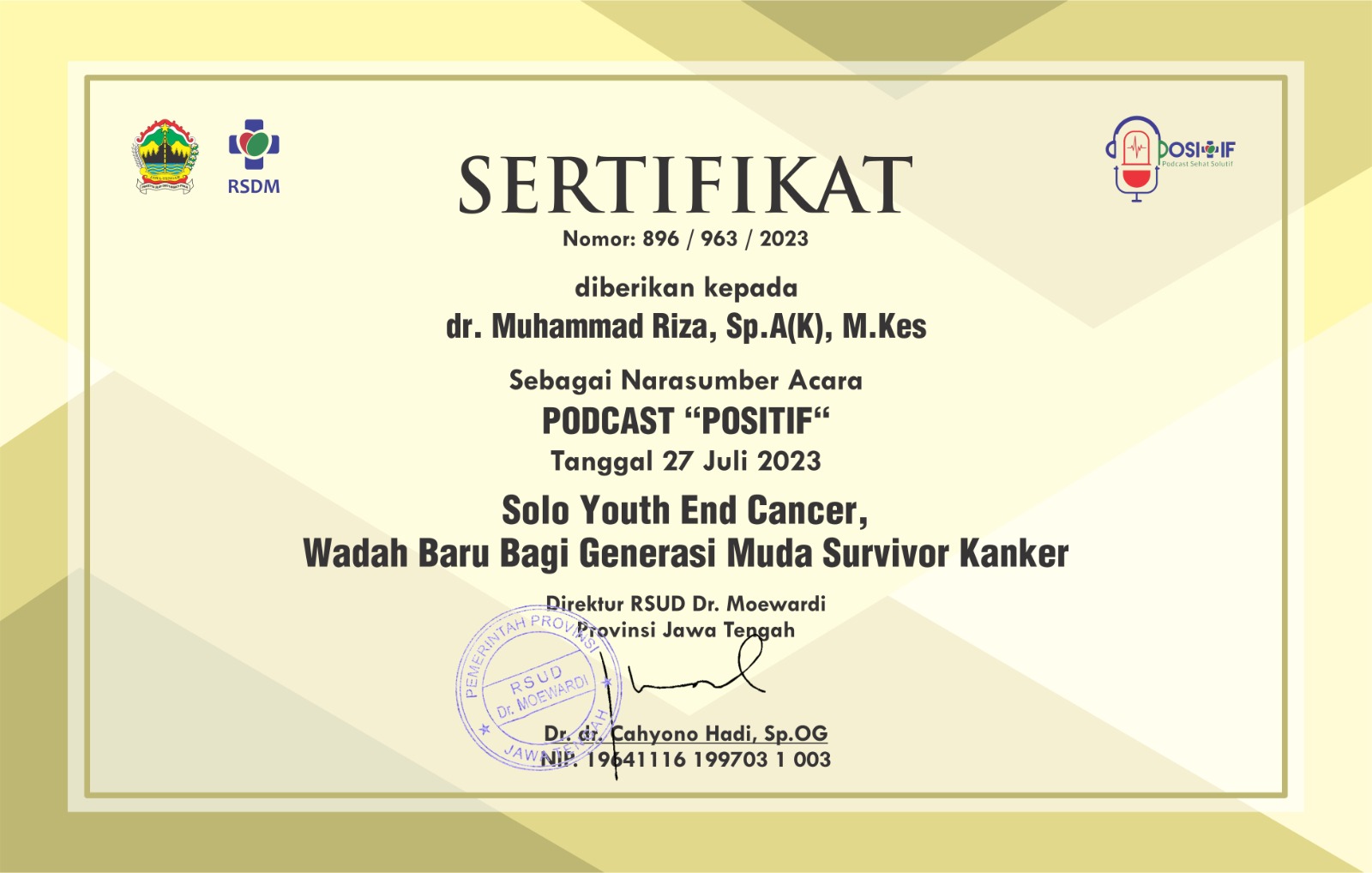 RSUD Dr. Moewardi memberikan informasi untuk meningkatkan mutu pelayanan kepada masyarakat dalam kegiatan live streaming "POSITIF (Podcast Sehat Solutif)" yang diadakan pada hari Senin, 12 Juni 2023 bertempat di DNA Spot Cafe Jl. Jaya Wijaya, Kadipiro, Kec. Banjarsari, Kota Surakarta, dengan topik "Solo Youth end Cancer, Wadah Baru Bagi Generasi Muda Survivor Cancer" . Narasumber adalah dr. Muhammad Riza, Sp.A(K), M.Kes yang merupakan dokter spesialis dokter spesialis anak dan staf pengajar sub divisi Hematologi Onkologi Anak.
