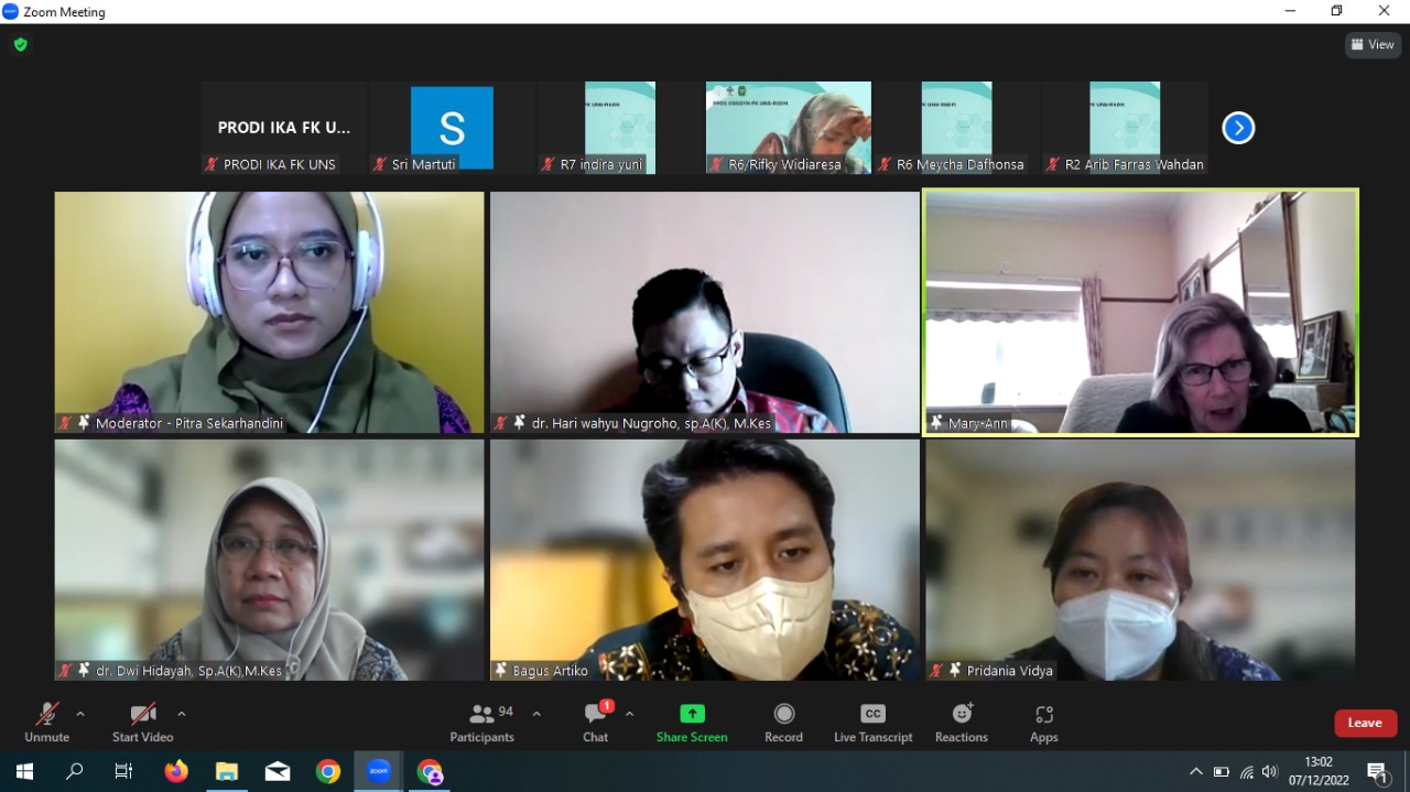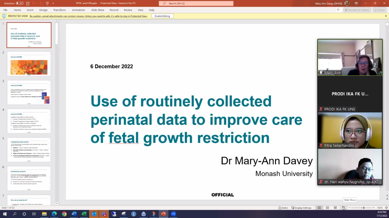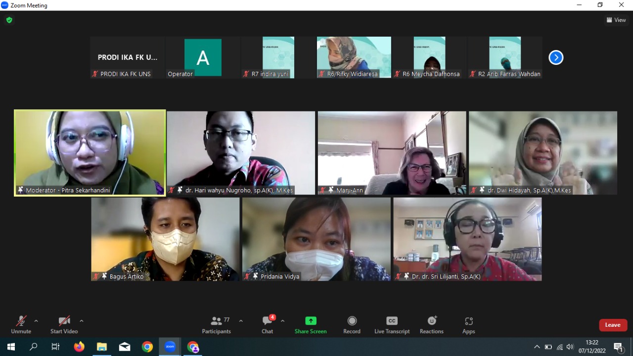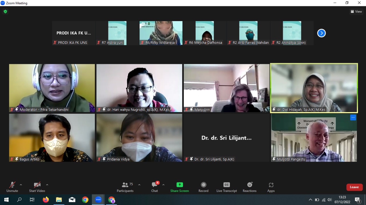 Kuliah tamu yang diadakan pada hari Rabu, 7 Desember 2022 dengan Pembicara oleh Dr. Marry-Ann Davey yang merupakan Senior Research Fellow, Obstetrics & Gynaecology Monash Health berkolaborasi dengan Prodi Ilmu Kesehatan Anak FK UNS dengan Local Speaker dr. Dwi Hidayah, Sp.A(K), M.Kes dan Panelis yang terdiri dari dr. Hari Wahyu Nugroho, Sp.A(K), M. Kes, dr. Bagus Artiko, Sp.A(K), M.Kes, dan dr. Pridania Vidaya, Sp.A. Kuliah tamu yang diikuti oleh PPDS dan Staf pengajar Prodi Ilmu Kesehatan Anak dan juga PPDS dan Staf Pengajar Prodi Obstetri dan Ginekologi. Sebagai moderator adalah dr. Pitra Sekarhandini, Sp.A. Dikarenakan adanya pandemi Covid 19 maka kuliah tamu dilakukan secara online menggunakan aplikasi zoom.