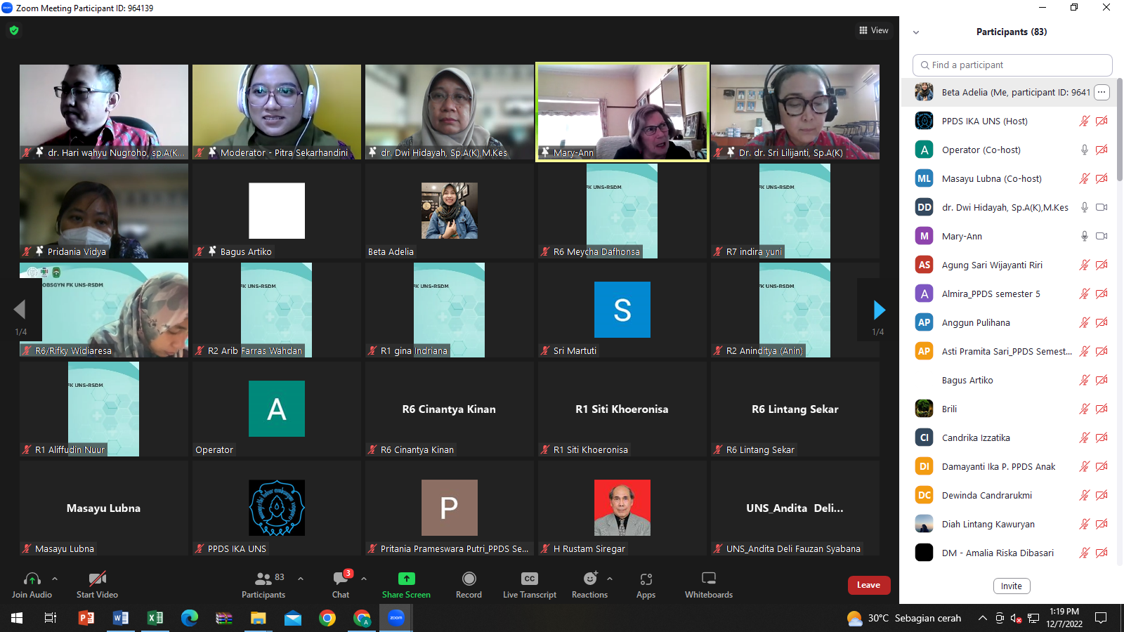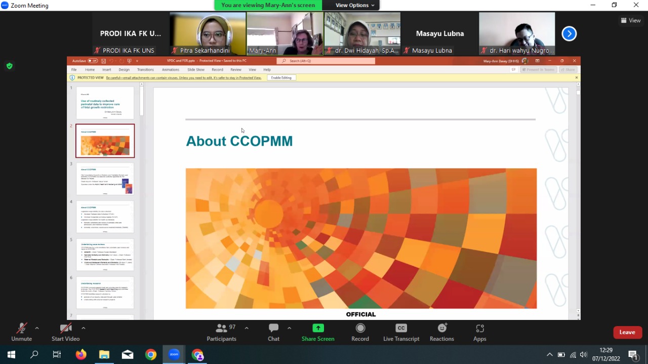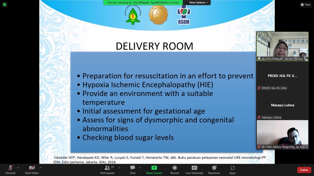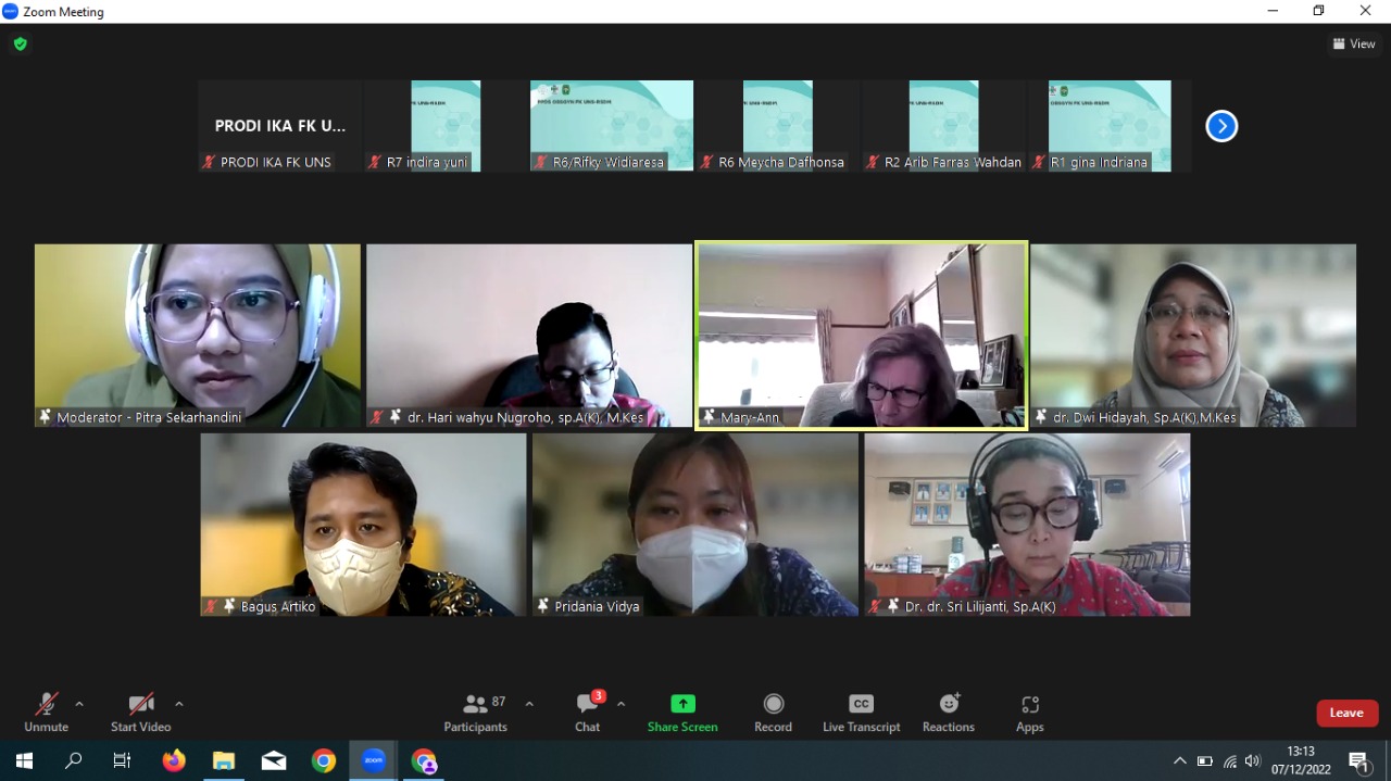 Kuliah tamu yang diadakan pada hari Rabu, 7 Desember 2022 dengan Pembicara oleh Dr. Marry-Ann Davey yang merupakan Senior Research Fellow, Obstetrics & Gynaecology Monash Health berkolaborasi dengan Prodi Ilmu Kesehatan Anak FK UNS dengan Local Speaker dr. Dwi Hidayah, Sp.A(K), M.Kes dan Panelis yang terdiri dari dr. Hari Wahyu Nugroho, Sp.A(K), M. Kes, dr. Bagus Artiko, Sp.A(K), M.Kes, dan dr. Pridania Vidaya, Sp.A. Kuliah tamu yang diikuti oleh PPDS dan Staf pengajar Prodi Ilmu Kesehatan Anak dan juga PPDS dan Staf Pengajar Prodi Obstetri dan Ginekologi. Sebagai moderator adalah dr. Pitra Sekarhandini, Sp.A. Dikarenakan adanya pandemi Covid 19 maka kuliah tamu dilakukan secara online menggunakan aplikasi zoom.