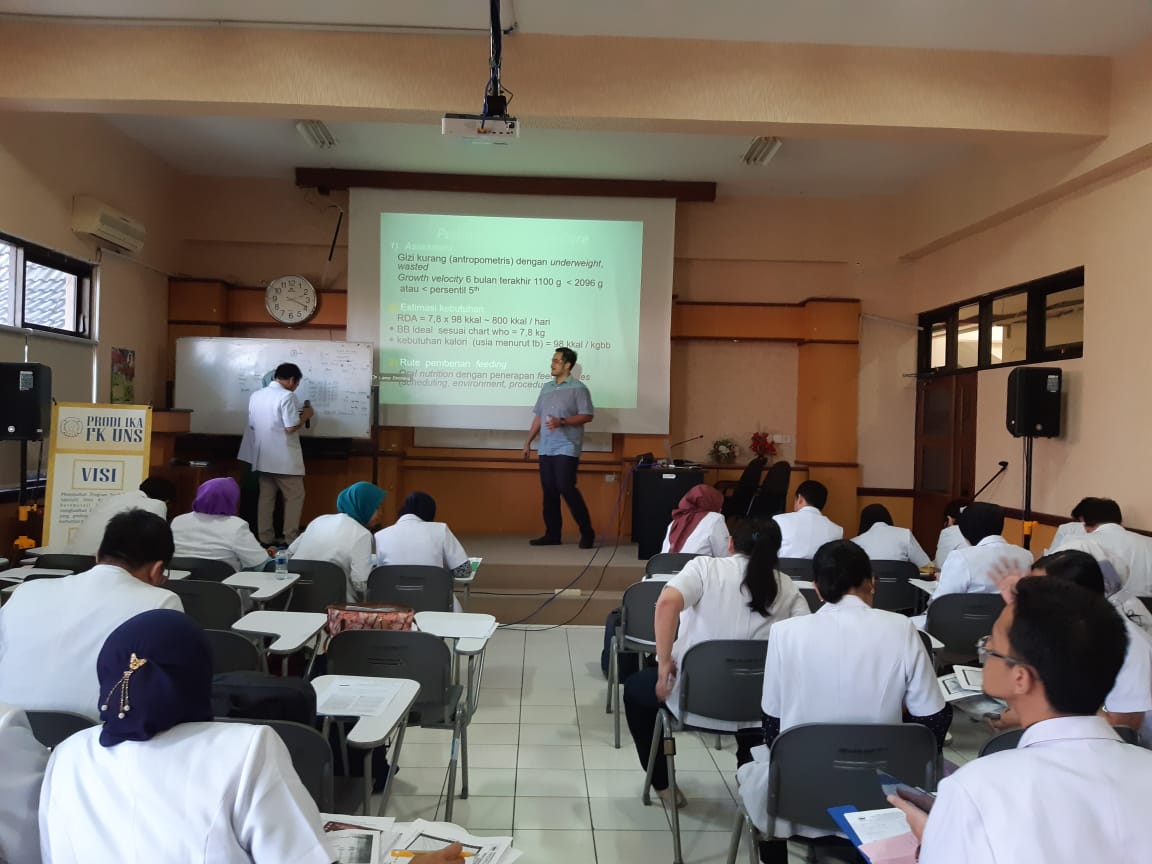 Prodi Ilmu Kesehatan Anak menyelenggarakan Workshop Kurikulum dengan tema "Pediatric Nutrition Care" yang dilaksanakan pada tanggal 13 Agustus 2019 di Ruang Diskusi I Prodi Ilmu Kesehatan Anak. Pembicara workshop adalah dr. Sandi Nugraha, Sp. A yang merupakan dokter spesialis anak dan staf pengajar sub divisi Nutrisi dan Penyakit Metabolik di Prodi Ilmu Kesehatan Anak FK UNS. Workshop diikuti oleh PPDS Prodi Ilmu Kesehatan Anak yang terdiri dari PPDS semester 1 - 4 (Tahap Junior - Tahap Madya).