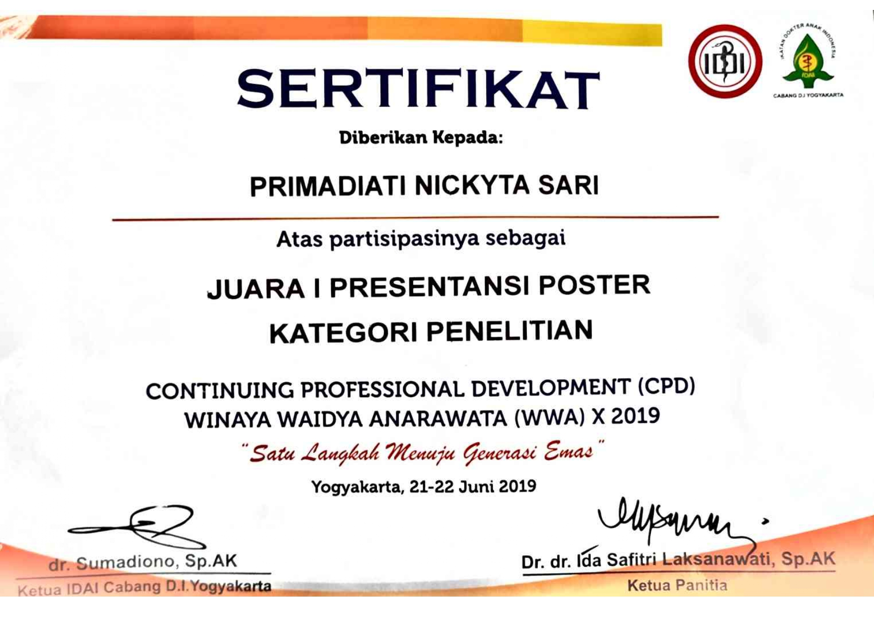 Selain Symposium dan Workshop yang diikuti oleh Mahasiswa, Dokter Umum, Dokter Spesialis juga diikuti oleh PPDS. Salah satu PPDS Prodi Ilmu Kesehatan Anak dr. Primadiati Nickyta Sari terpilih sebagai Juara I Presentasi Poster dengan judul The Relationship Between Patent Ductus Arteriosus Size and Gestational Age, Birth Weight, As Well As Head Circumference of Neonates in Dr. Moewardi General Hospital