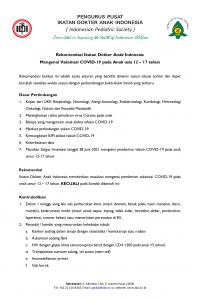 Rekomendasi Ikatan Dokter Anak Indonesia Mengenai Vaksinasi COVID-19 pada Anak usia 12 – 17 tahun